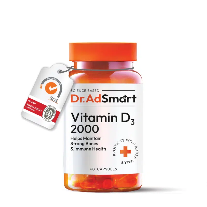 Food supplement. Dr.AD Smart Vitamin D3 2000 Vitamin D contributes to the normal functioning of the immune system. Vitamin D helps maintain bone health, normal muscle function and dental health. Vitamin D contributes to the normal absorption/utilisation of calcium and phosphorus and helps maintain normal blood calcium levels.
