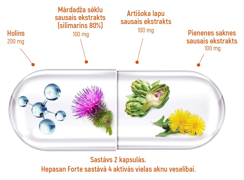 Hepasan Forte sastāvā ir divi atzītākie hepatoprotektori - holīns un silamarīns, kas iegūts no mārdadža, kā arī pienenes saknes sausais ekstrakts un artišoka lapu sausais ekstrakts.