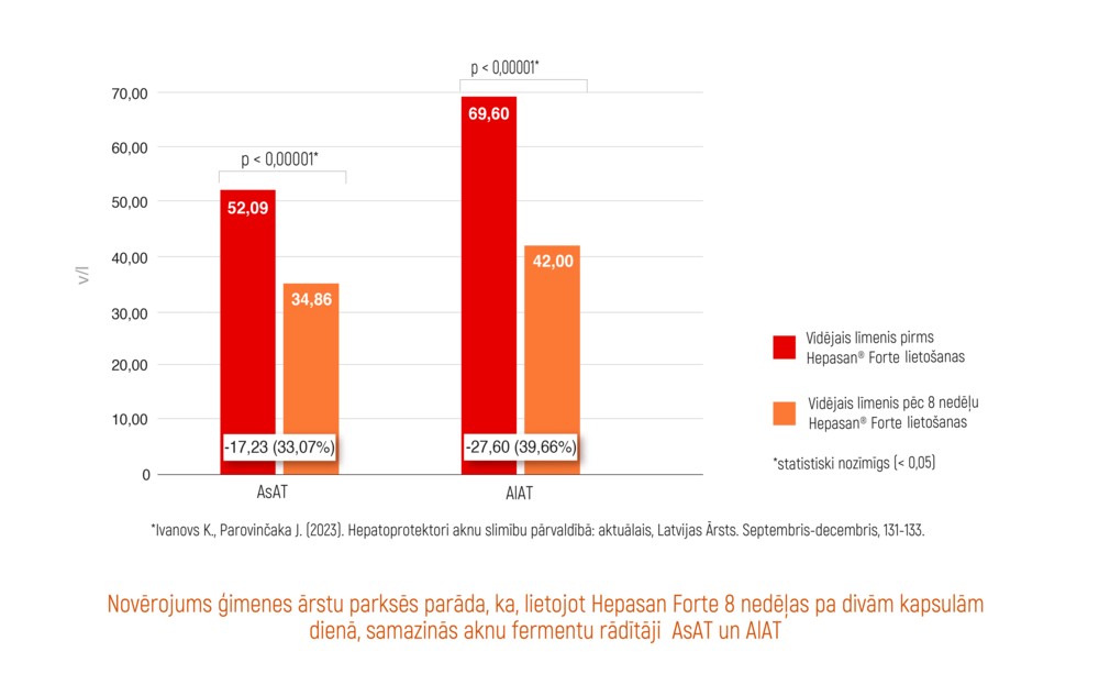 Hepasan Forte efektivitāte ir pierādīta novērojumā, kas veikts sadarbībā ar Latvijas ģimenes ārstiem. Novērojumā piedalījās 88 pacienti, kuri 8 nedēļas lietoja Hepasan Forte pa 2 kapsulām dienā. Izvērtējot datus pirms un pēc novērojuma, tika secināts, ka, lietojot Hepasan Forte astoņas nedēļas pa divām kapsulām dienā, satistiski nozīmigi pazeminās AsAT un AlAT līmenis.(1) 1. Ivanovs K., Parovinčaka J.(2023). Hepatoprotektori aknu slimību pārvaldībā: aktuālais, Materia Medica. Septembris, 49-52.