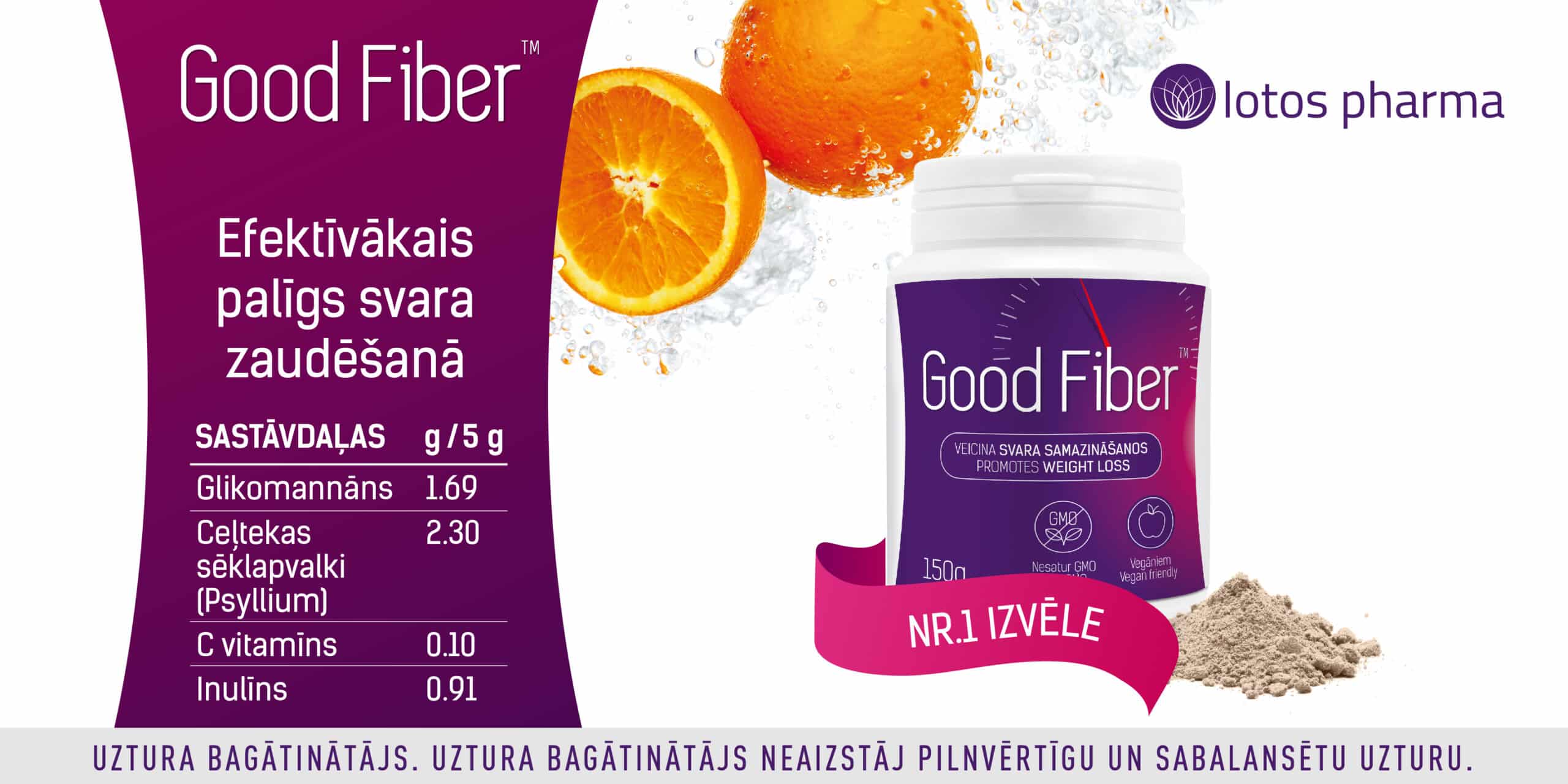 Good Fiber ir papildu šķiedrvielu un vitamīna C avots. Ieteicams no 6 gadu vecuma cilvēkiem, kuri ikdienā neuzņem pietiekamā daudzumā šķiedrvielas, kā arī tiem kam ir paaugstināts ķermeņa masas indekss.