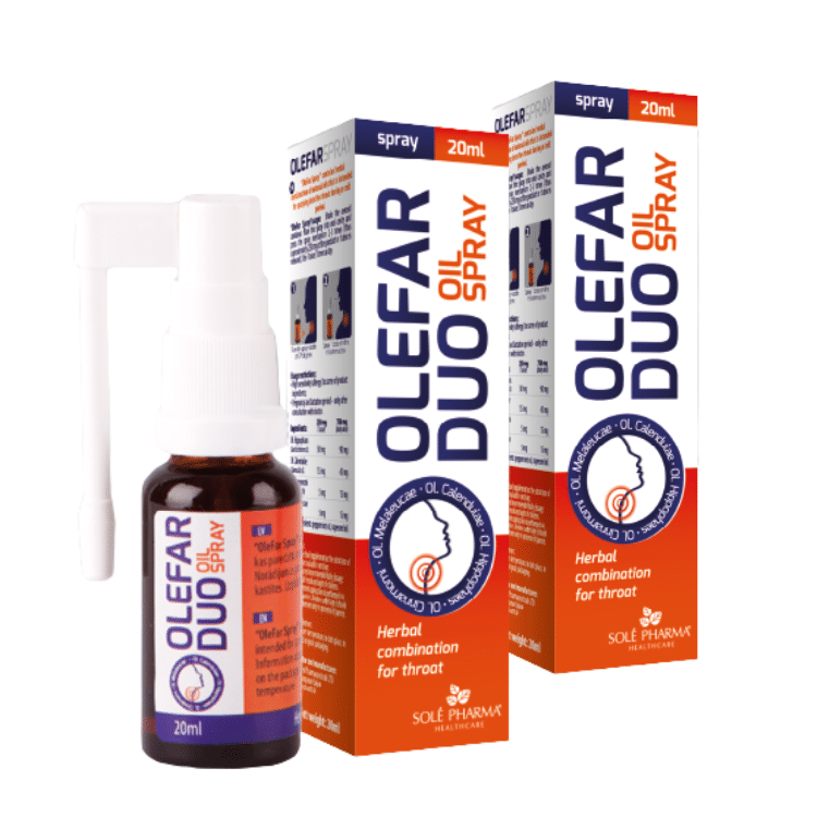 Olefar® DUO Oil Spray ir uz eļļas bāzes veidots līdzeklis, kura sastāvā esošas dabīgas eļļas pārklāj mutes dobuma un rīkles gala gļotādu, tādējādi palīdz uzturēt gļotādu mitru un elastīgu, mazina diskomforta sajūtu un sāpes, kā arī samazina skrāpēšanas sajūtu kaklā.