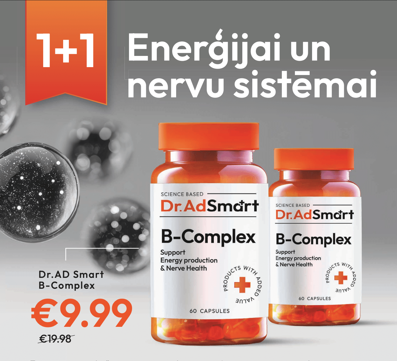 Dr. AD Smart B-Complex bez septiņiem B vitamīniem satur arī holīnu, kas palīdz uzturēt normālu aknu darbību. B grupas vitamīni ir svarīgi normālai enerģijas ieguves vielmaiņai un nervu sistēmas darbībai. Faktiski, vairums pētījumu liecina, ka B vitamīnam ir visspēcīgākais “energoefekts” - tas palīdz iegūt enerģiju no pārtikas, lai to varētu izmantot visas šūnas. B1 vitamīns (tiamīns) specializējas glikozes sadalīšanā, bet B2 vitamīns palīdz pārveidot taukus un olbaltumvielas enerģijā, kas ir īpaši svarīgi sirdij un muskuļiem. B6 vitamīns (piridoksīns) piedalās desmitiem ķīmisko reakciju, kurās tiek iegūta enerģija no olbaltumvielām, ogļhidrātiem un taukiem. B6 un B12 vitamīni ir nepieciešami sarkano asins šūnu veidošanai, kas piegādā skābekli šūnu enerģijas ražošanai. B3 vitamīns ne vien palīdz atbrīvot enerģiju no pārtikas, bet ir nepieciešams arī vairogdziedzera hormonu ražošanai, un, ja tā trūkst, var rasties nogurums.